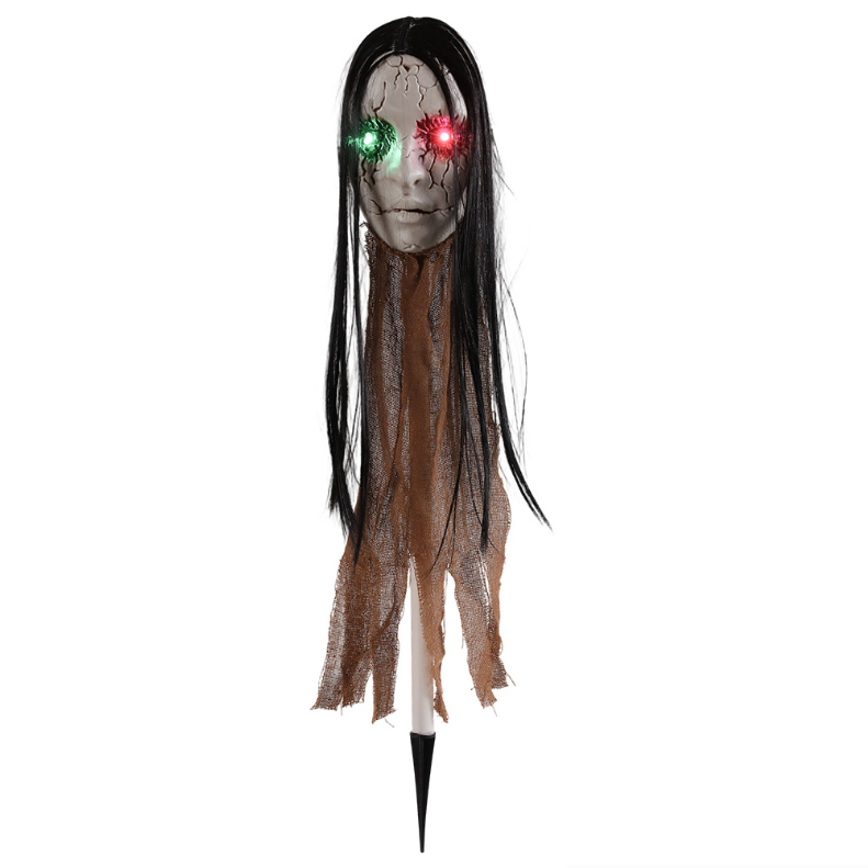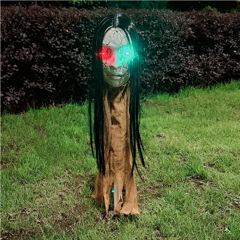 Pale face + disheveled black hair, resembling a crime scene on the lawn; at night: eye lights automatically illuminate + sway in the breeze, creating a spine-chilling silhouette in the darkness. Suitable for gardens, haunted houses, parties, or even hidden in a car trunk to prank friends.