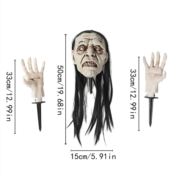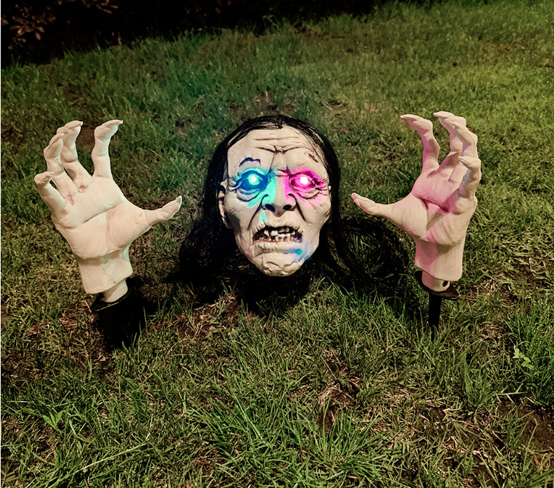 Realistic crawling design, decaying face + withered claw details, built-in LED eye lights that automatically emit light. When triggered, the head slightly shakes, resembling a vengeful spirit emerging from the ground, causing passersby to scream and flee instantly.