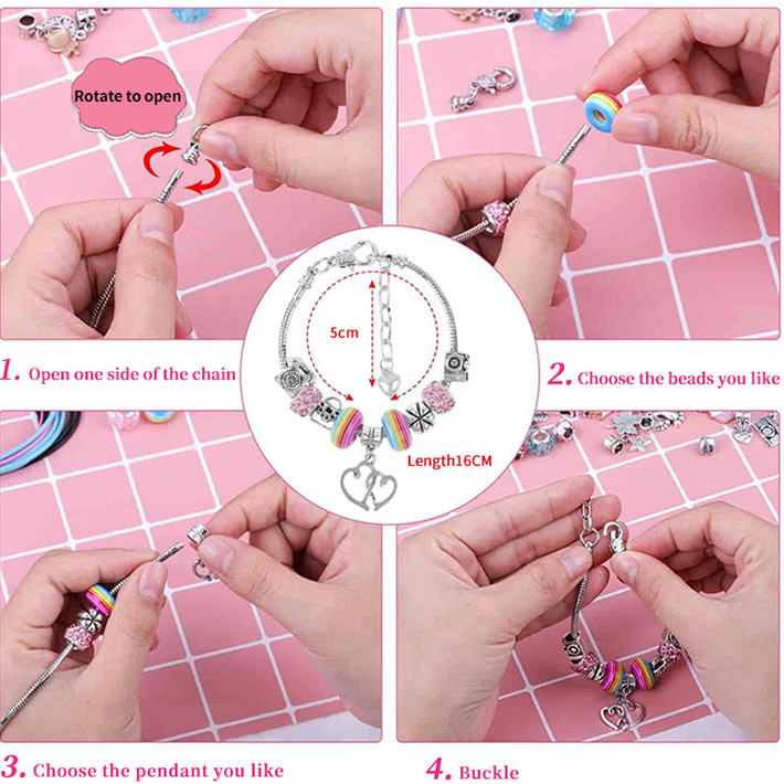 | DIY bracelet set gift box, color is pink, material is PU leather with velvet lining, size is approximately 1.96 x 3.54 x 3.93 inches. Once you have made the bracelet, you can put it inside the box to keep as a treasure or give it as a gift. |