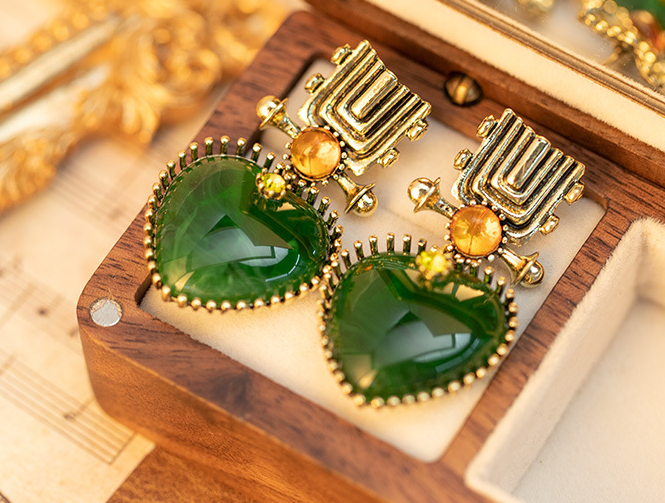 The rich emerald green color tone is bright and white, paired with warm golden metal and orange-yellow small gems. The color contrast is strong yet harmonious, creating a strong visual impact that instantly catches the eye in a crowd. It is the “finishing touch” to any outfit.